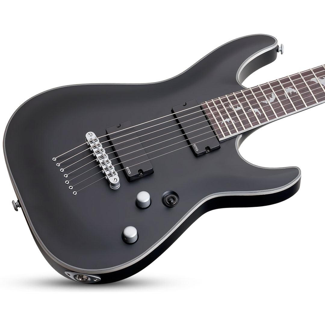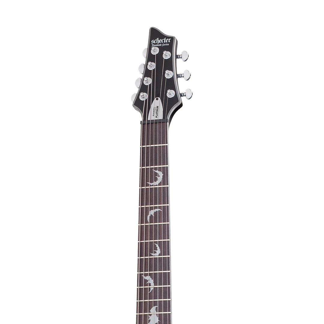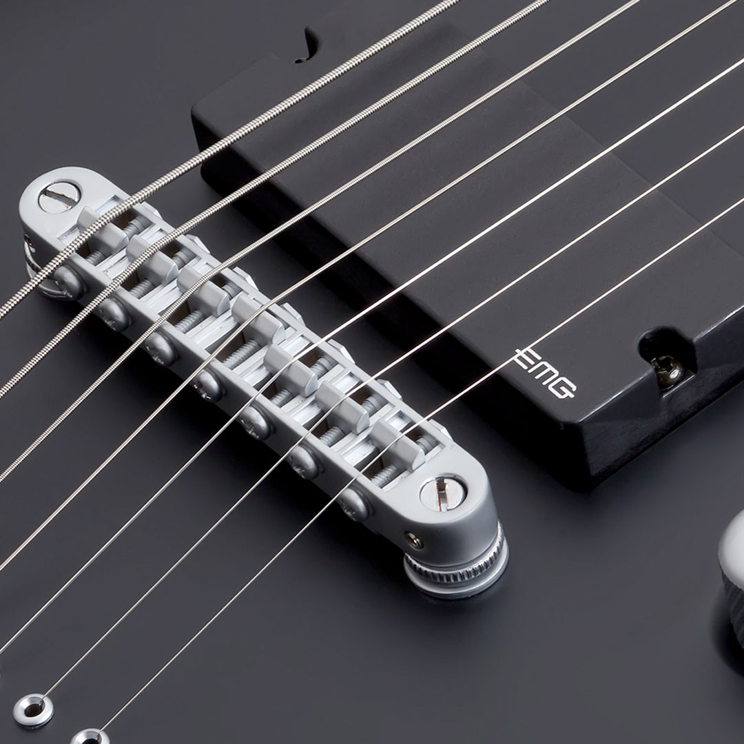 Adorned with our infamous and often imitated "bat" inlays and a lethal EMG 81/85 combo, our Damien Platinum collection has the look and sound to shock and rock. The satin black finish with platinum silver trim adds just the right amount of sinister to style.