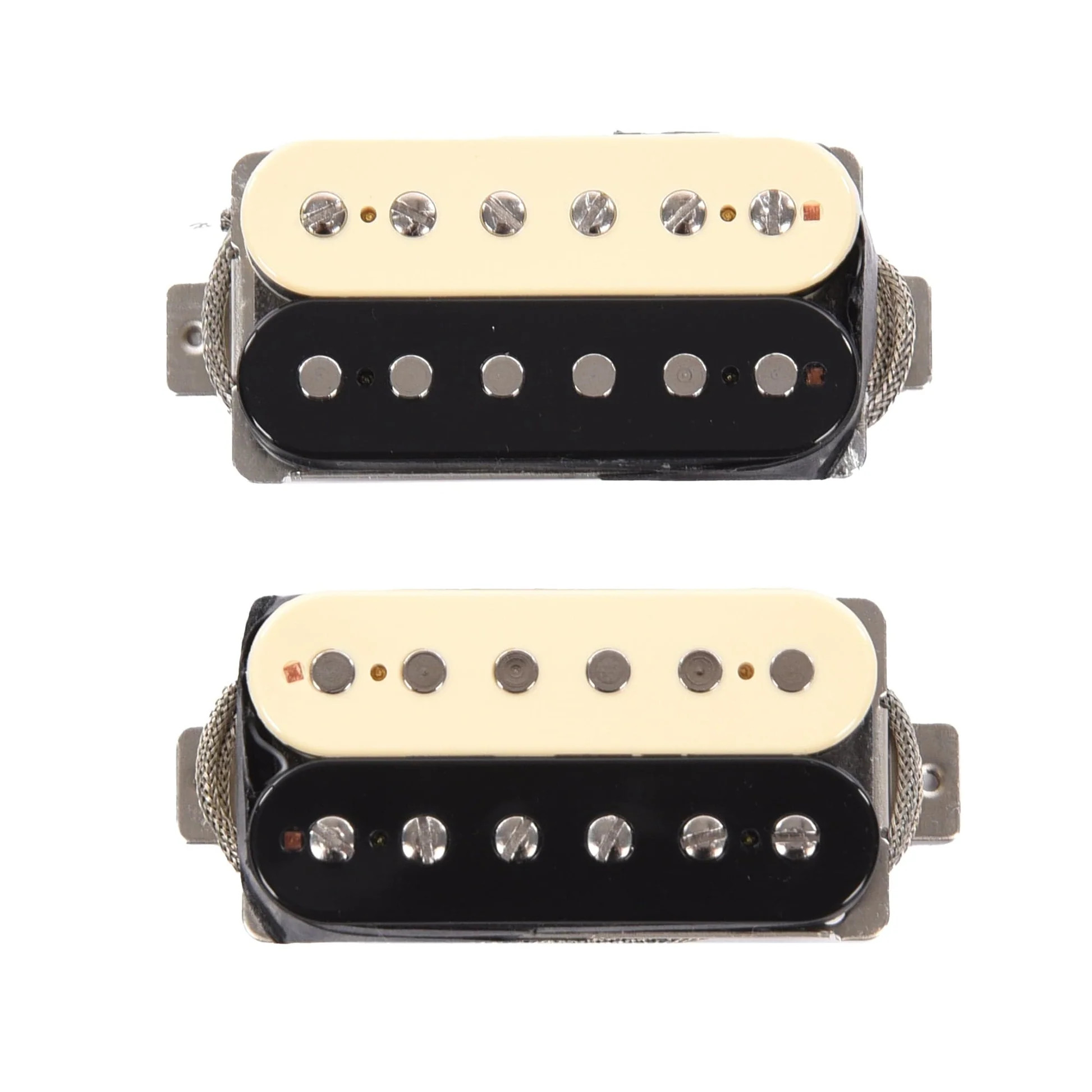 The zebra/reverse zebra coil colors provide distinctive visual appeal—zebra configuration in the neck position (black coil facing bridge, cream coil facing neck) and reverse zebra in the bridge position (cream coil facing bridge, black coil facing neck). Hand-built in Santa Barbara using authentic vintage-style construction including nickel silver bottom plates with long mounting legs, single-conductor braided lead wire, maple spacers, paper tape, and wax potting, these pickups maintain the premium build quality that professional musicians demand.