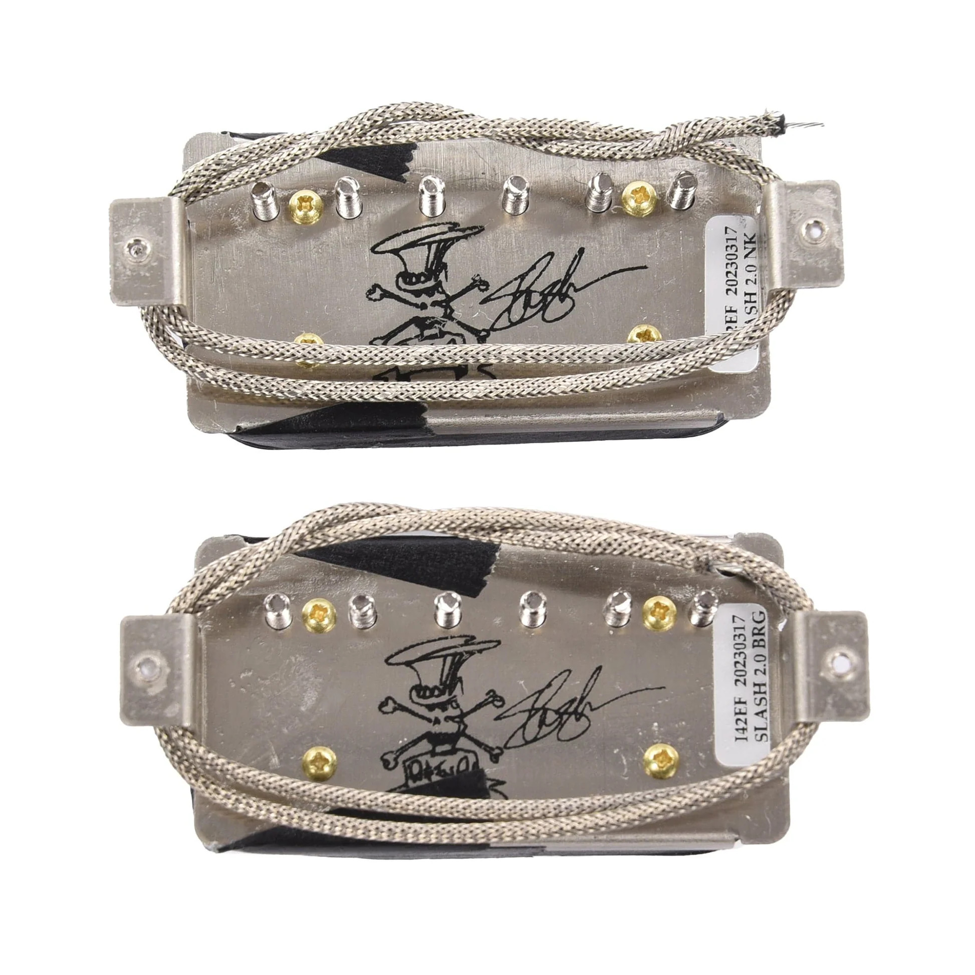 The Seymour Duncan Slash 2.0 Signature humbucker set in zebra/reverse zebra configuration combines enhanced output refined through years of world touring with the distinctive visual aesthetic of classic PAF-style pickups. This evolution of the beloved APH-2 set delivers hotter wind specifically developed for demanding live performance applications while maintaining the warm, singing tone and exceptional clarity that define Slash's signature sound.